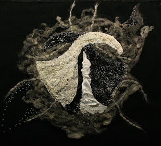 A little studie for a page I wil making for a swap on velvet I used painted bondaweb and angelina fiber on top of that organza free motion embriodery and than burnt